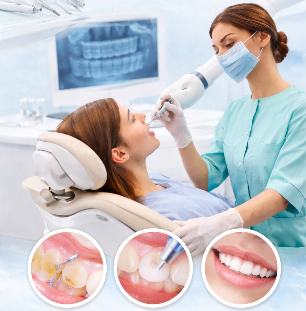 Scaling and polishing is a professional dental cleaning treatment that removes plaque, tartar, and surface stains from your teeth. Over time, bacteria and food particles create plaque on teeth. If plaque is not removed properly through brushing and flossing, it hardens into tartar (calculus), which cannot be removed at home.